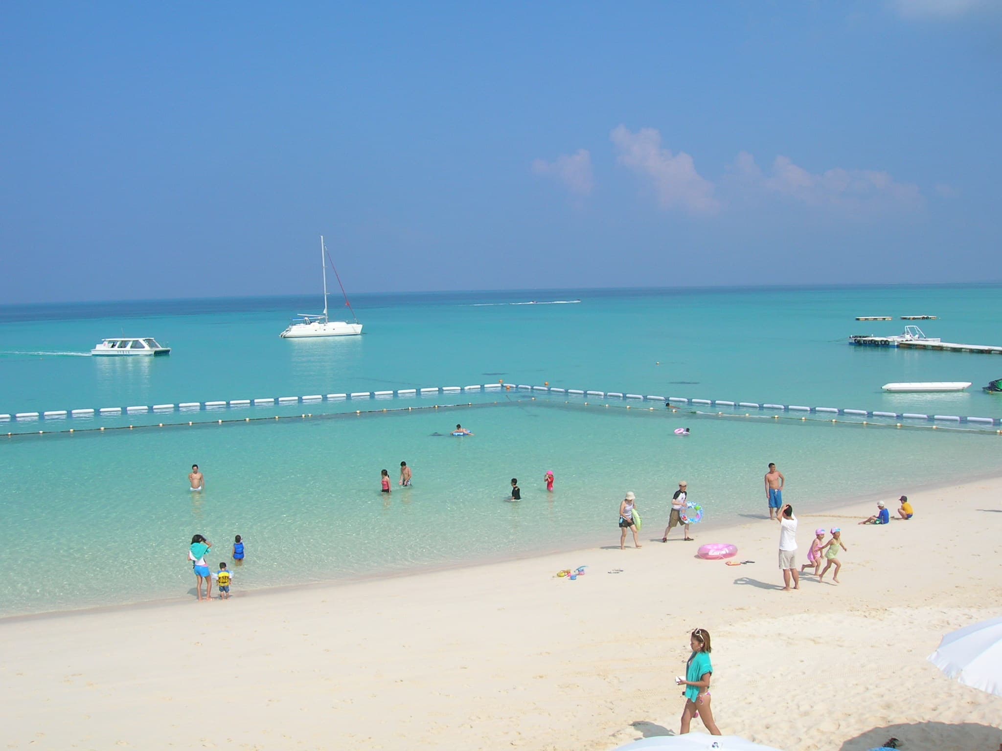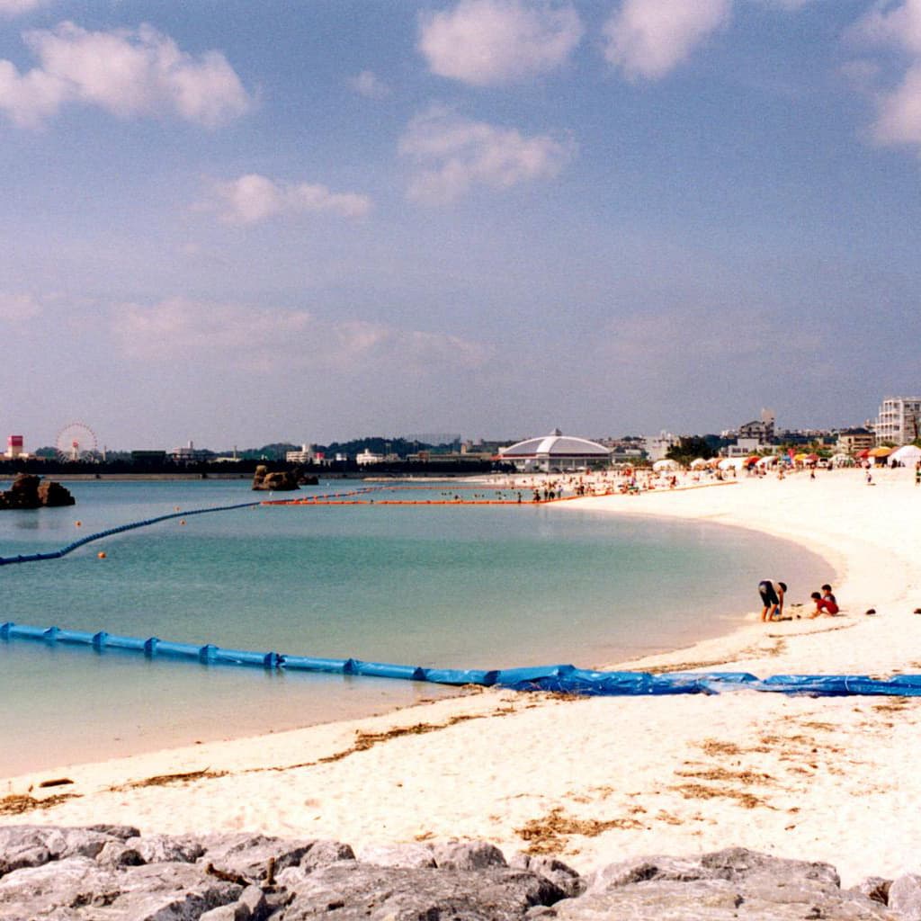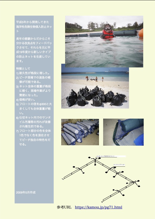 当時海上に浮かぶフェンスはオレンジ色一色だったのですが、観光立県たる沖縄で多くの観光客が訪れるビーチで危険を示すオレンジ色は野暮だろうと考え、弊社が本邦初めて民間ビーチである糸満市の名城ビーチにブルー色のフエンスのハブクラゲ防止ネットを英断設置しました。最初ブルー??との違和感も世間一般にはあったのものがその後全てブルー色の物に取って代わるようになりました。写真は全長500mの防止ネットを設置した時のものです。