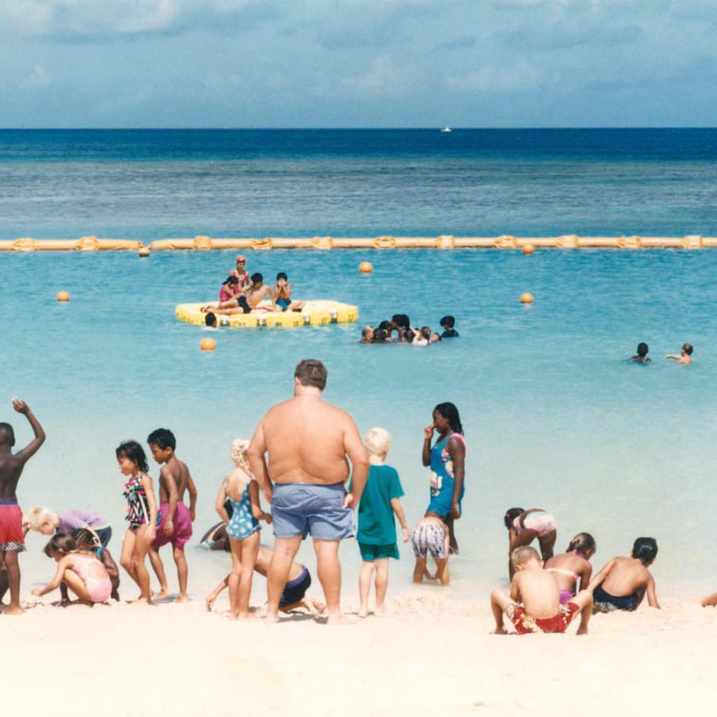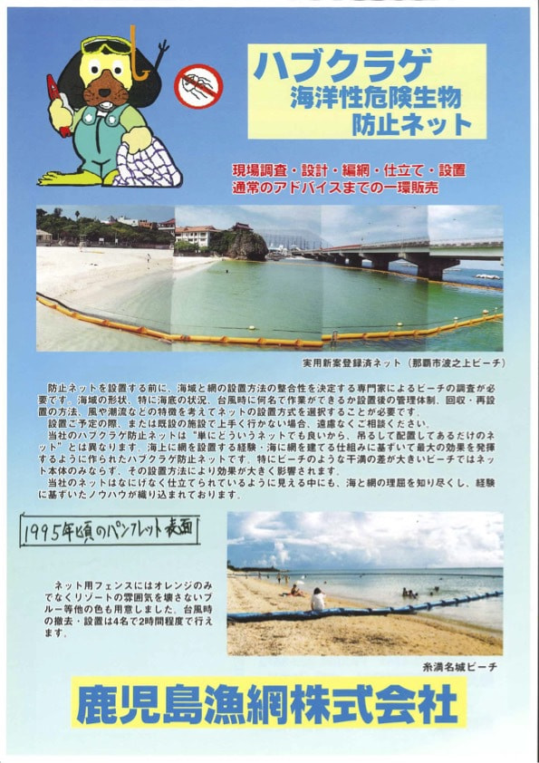 1993年に弊社のハブクラゲ防止ネットが県内第1号として宜野湾市のトロピカルビーチに設置されました。オレンジ色の汚濁防止膜を利用したもので、設置年度の1年間は台風接近ごとのネットの一時撤去、通過後の再設置とその年数回、弊社も勉強に一緒に作業をお手伝いし多くの事がその後の防止ネット作りのために分かりました。